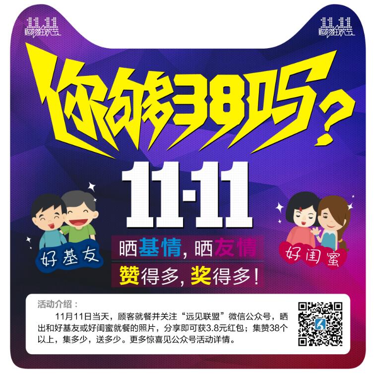 11.11,光棍節(jié),不要再羨慕那些有男朋友或者女朋友的人了,因?yàn),遠(yuǎn)見聯(lián)盟推出的雙11“你夠38嗎?”主題活動(dòng)只有曬好基友、好閨蜜照片的親們才能拿到紅包,而且有多少人支持你,你就能得到多少元的紅包!