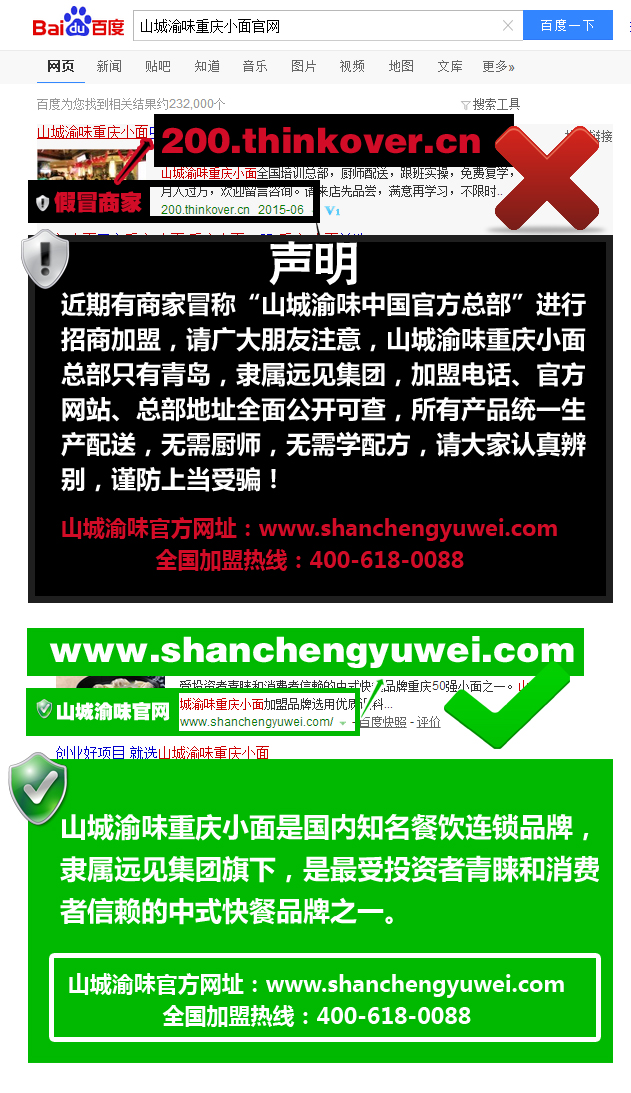 目前有多家假冒山城渝味重慶小面的網(wǎng)站在進(jìn)行招商加盟,圖片暫舉一例,望廣大朋友加盟之前一定要認(rèn)清!有問(wèn)題請(qǐng)致電4006180088